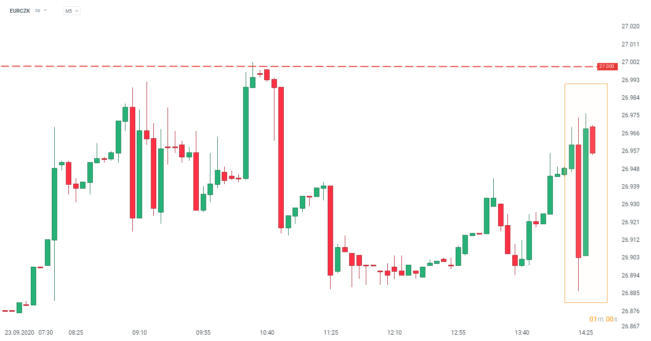 Reakce české koruny na rozhodnutí o sazbách nebyla výrazná. Pár EURCZK se krátce po zveřejnění rozhodnutí o sazbách udržel pod úrovní 27 korun za euro. Volatilita dosáhla v prvních minutách po zveřejnění cca 10 pips. Reakce odpovídala výsledku dle širokého očekávání trhu.