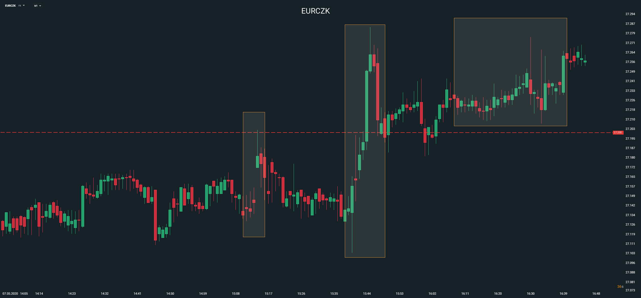Pár EURCZK měl v reakci na překvapivě prudké snížení sazeb ČNB tendenci oslabovat. Přiblížil se úrovni 27,30. Zdroj: xStation5