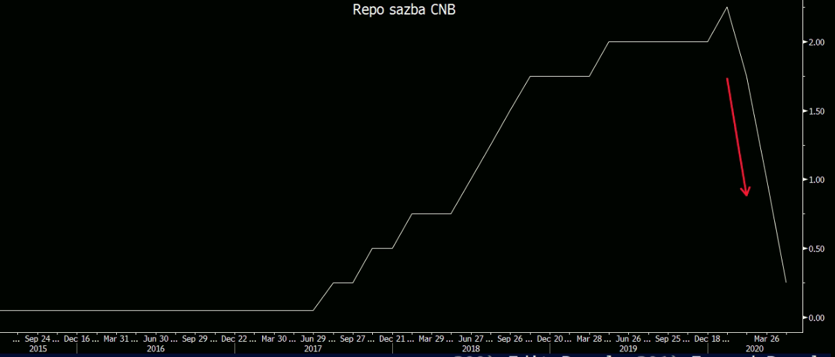 Základní dvoutýdenní repo sazba byla na dnešním zasedání ČNB snížena o 75 bps na 0,25 %. Zdroj: Bloomberg
