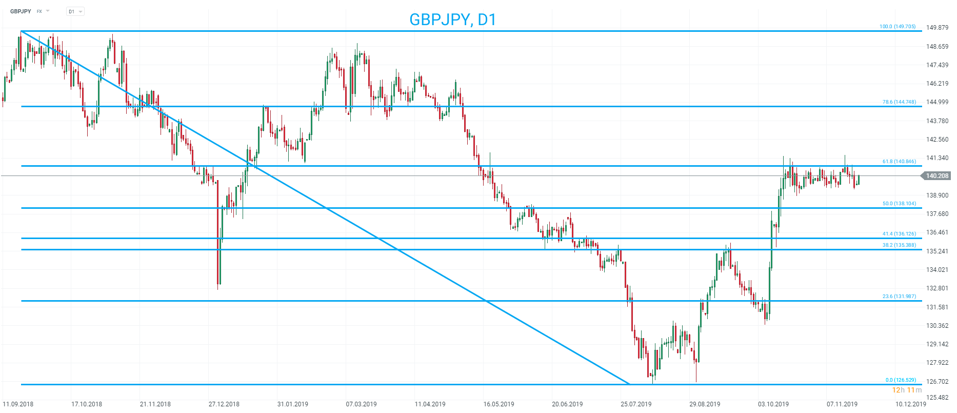 Pár GBPJPY je typicky nejvíce volatilní librový pár v reakci na velké politické události. Z grafu je zřetelné, že posledních více než 5 týdnů se pár pohybuje v úzkém rozmezí. Za nejdůležitější vnímáme v současnosti hladinu 61,8 % Fibo retracementu, která má za sebou už několik pokusů o průraz. Uzavření nad touto úrovní by bylo vnímáno jako průraz rezistence. Zdroj: xStation