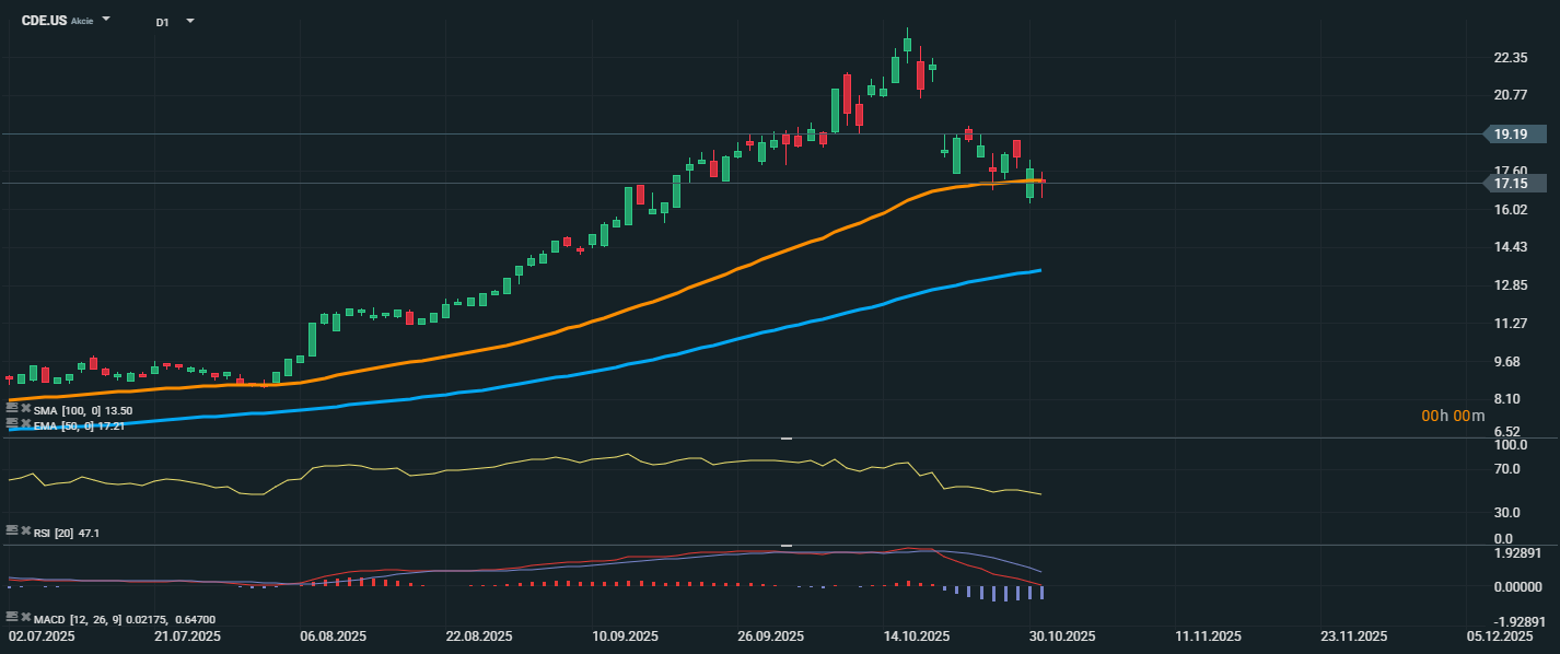 Akcie spoločnosti Coeur Mining po dosiahnutí maxima pri úrovni 22 USD zaznamenali výraznejšiu korekciu a aktuálne sa obchodujú okolo 17,15 USD, čo zodpovedá blízkosti EMA 50 (17,21 USD). Táto úroveň môže slúžiť ako krátkodobá technická podpora, pričom SMA 100 (13,50 USD) leží podstatne nižšie a naznačuje predchádzajúci silný rastový trend.