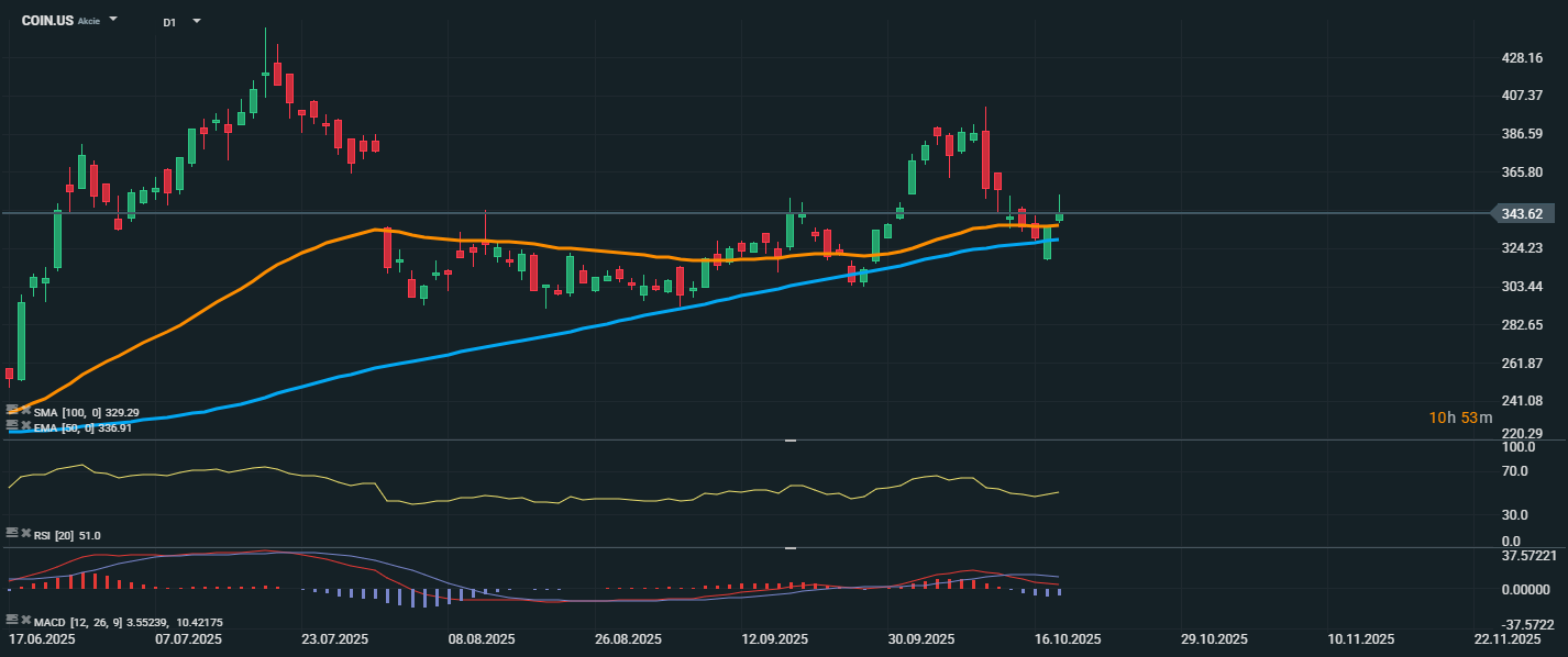 Akcie spoločnosti Coinbase sa aktuálne obchodujú na cene 343,62 USD. Dnešná sviečka prerazila späť nad kĺzavý priemer EMA 50 (336,91 USD) aj nad SMA 100 (329,29 USD), čo možno vnímať ako pozitívny technický signál a potenciálny začiatok nového rastového impulzu. RSI sa nachádza na hodnote 51,0, čo značí neutrálnu zónu – trh nie je ani prekúpený, ani prepredaný, a priestor na rast tak zostáva otvorený. MACD sa blíži k potenciálnemu býčiemu prekrižovaniu, zatiaľ čo histogram naznačuje postupné oslabovanie predchádzajúceho klesajúceho trendu.