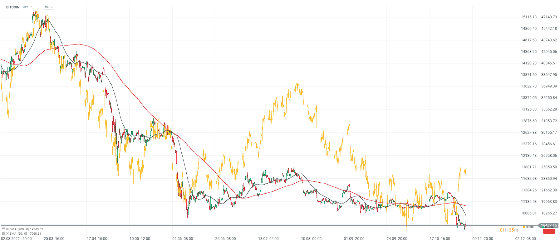 Bitcoin, interval H4. Největší kryptoměna nadále vykazuje divergenci vůči americkému akciovému trhu, se kterým koreluje téměř celý rok. To ukazuje, že současné faktory poklesu Bitcoinu jsou jednoznačně interní a jsou způsobeny hrozbou systémového rizika pro trh s kryptoměnami. To nyní radikálně mění býčí scénář býků, který předpovídal oživení Bitcoinu v souvislosti s nárůstem globálního apetitu k riziku. Zdroj: xStation5