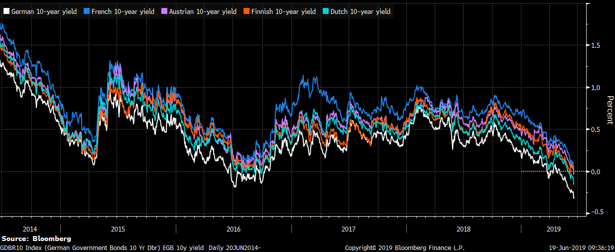 Jedna zajímavost ze světa dluhopisového trhu. Už nejenom Německo a Dánsko, ale po včerejším projevu šéfa ECB Maria Draghio si za negativní úroky na deset let mohou půjčovat také Francie, Rakousko a Finsko. ECB sice ještě nic neudělala a dokonce ukončila QE, ale i tak znovu tlačí sazby na nová rekordní minima. Nepomáhá tím pouze akciovým trhům, ale také státům, které nyní žijí sen každého dlužníka, když mohou opět vydělávat na tom, že se zadlužují.