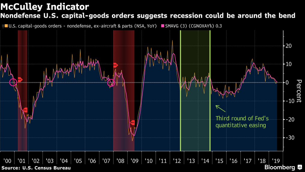 Ďalší indikátor poukazuje na príchod recesie. Jedná sa konkrétne o vývoj objednávok dlhodobej spotreby v USA okrem vojenských objednávok a objednávok lietadiel. Ukazovateľ vývoja objednávok je od novembra 2017 v klesajúcom trende. V priebehu posledných 20-tich rokoch, došlo v priemere do troch mesiacov k recesii (2001, 2007) v prípade, ak došlo k poklesom objednávok, teda indikátor klesol pod 0%. V roku 2010, keď začali objednávky klesať, pomohlo podporiť hospodársky rast kvantitatívne uvoľňovanie, ktoré pomohlo odvrátiť recesiu.