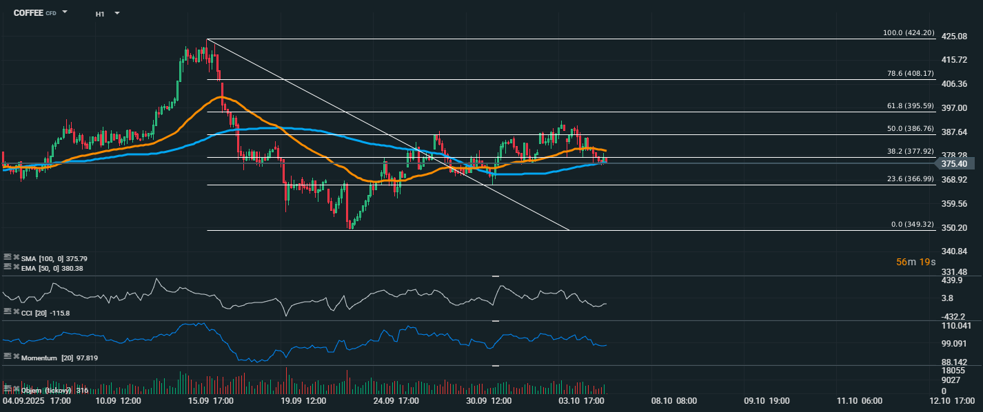 Cena kávy sa aktuálne pohybuje okolo 375,40 USD, teda pod úrovňou 38,2 % Fibonacciho retracementu. Súčasne sa nachádza tesne pod EMA 50 (380,38 USD) a mierne pod SMA 100 (375,79 USD), čo naznačuje prechod do neutrálnej až mierne medvedej fázy.