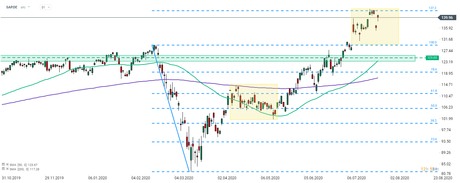 SAP (SAP.DE) začal dnešní seanci vysokým býčím cenovým gapem a přes následnou korekci se obchodují nad páteční zavírací cenou. Pokud se budou akcie obchodovat nad úrovní 130 euro, která byla předpandemickým maximem, tak se býci nemusejí obávat. Nejbližší rezistenci vidíme na úrovni posledního maxima v blízkosti úrovně 127,2 % externího Fibo retracementu únorového a březnového pádu (€ 142,50). Zdroj: xStation5