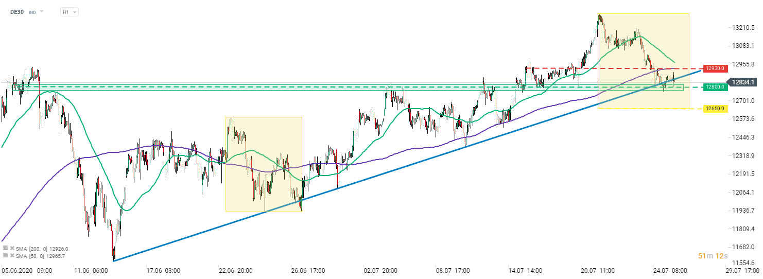 Nová data naznačují silný start do třetího kvartálu. Všechny sledované indexy rostly ve srovnání s předcházejícím měsícem. Hodnocení současné situace se však nepodařilo naplnit odhady analytiků. Ekonomové Ifo potvrdili výhled růstu německé ekonomiky ve Q3 na úrovni 6,9 %. Index DE30 reagoval na zveřejnění pozitivně a dostal se ze ztrát, které utrpěl na počátku obchodování.