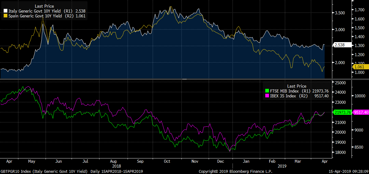 V posledných mesiacoch zaznamenal španielsky dlhopisový trh pomerne výrazný nárast. Vzhľadom na to, že španielska ekonomika nie je ani zďaleka taká stabilná ako v Nemecku, zvýšený dopyt po španielskych dlhopisoch môže poukazovať na lepší sentiment voči investíciám v krajine. Španielske úroky na dlhopisoch voči talianskym dosahujú značný pokles. Akciové indexy oboch krajín sa však pohybujú prakticky rovnako (Taliansko však čelí hroziacej recesii).