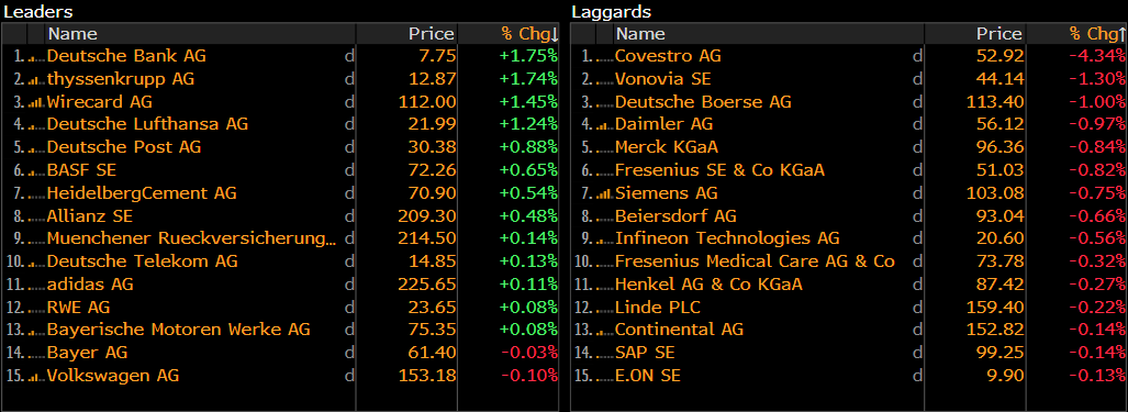 Napriek tomu, že akciové trhy otvorili v zelených číslach, väčšina akcií z akciového indexu DAX začala neskôr klesať. Zdroj: Bloomberg