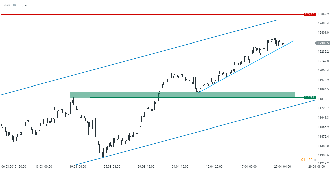 Cena sa opäť odrazila od modrej trendovej čiary, z tohto hľadiska možno očakávať nárast na nové tohtoročné maximá. V prípade tohto scenára by sa vytvoril potenciál rastu k úrovni 12570 bodov, čo je línia, kde niektorí kupujúci môžu uvažovať o vystúpení z trhu. Na druhej strane, pokles pod túto hranicu by otvoril priestor pre pokles smerom nadol k úrovni 11820 bodov. Dnešné dáta HDP z USA by mohli ovplyvniť sentiment na Wall Street a tým aj európske indexy. Zdroj: xStation5