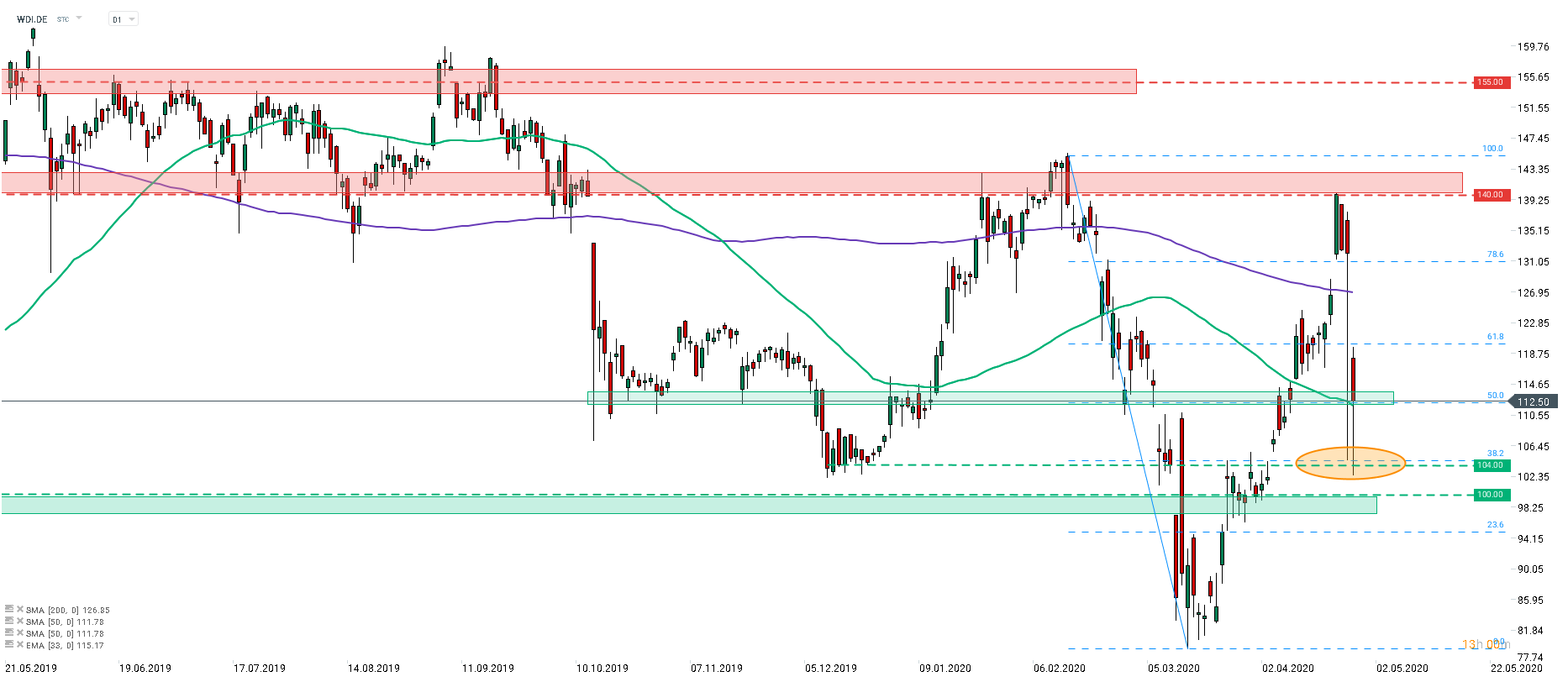 Akcie spoločnosti Wirecard (WDI.DE) dnes otvorili výrazne nižšie a v prvých hodinách obchodovania pokračovali v poklese. Cena klesla pod 50% úroveň Fibo. Pokles bol zastavený pri 38,2% Fibo úrovni, ktorá sa zhoduje s minimami od decembra 2019 (oranžový kruh). Veľkým cieľom predajcov je podpora na úrovni 100 EUR, zatiaľ čo zóna kľúčového odporu sa pohybuje okolo 50% úrovne Fibo. Zdroj: xStation5