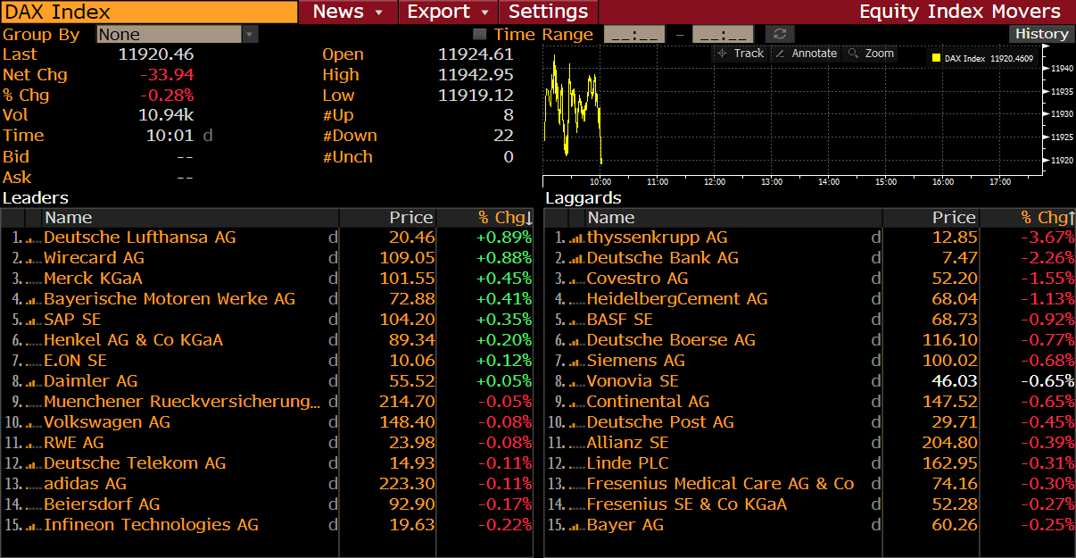 Väčšina akcií z indexu DAX zaznamenala pokles po prvých minútach štvrtkového obchodovania. Zdroj: Bloomberg
