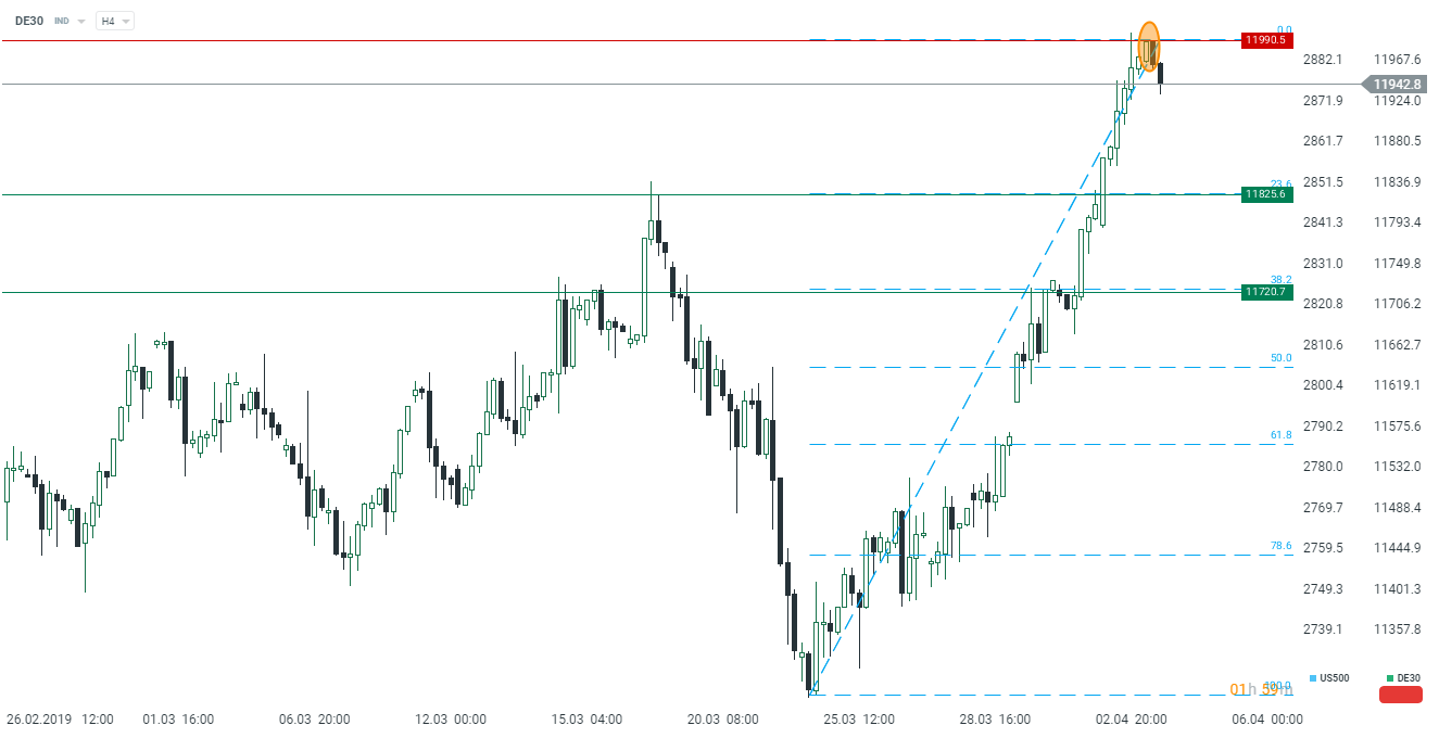 Na týždennom grafe DE30 sa môže vytvoriť medvedí pattern engulfing po odrazení ceny z úrovne 12000 bodov. V dôsledku toho nie je možné vylúčiť pokles k úrovni 11825 až 11720 bodov. Zdroj: xStation5