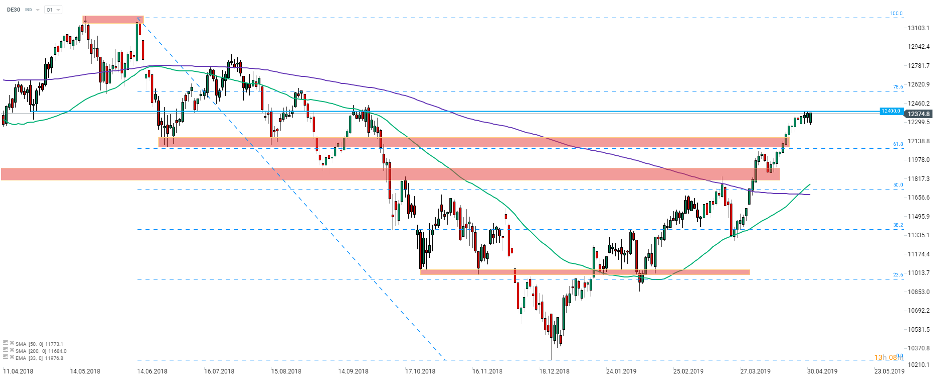 Rally na DE30 (podkladové aktívum DAX) pokračuje k úrovni 12400 bodov. Táto rezistencia môže predstavovať prekážku pre ďalší rast ceny. Aj keď rally smerom nahor pokračuje, dynamika rastu sa môže postupne vytrácať. Zdroj: xStation5
