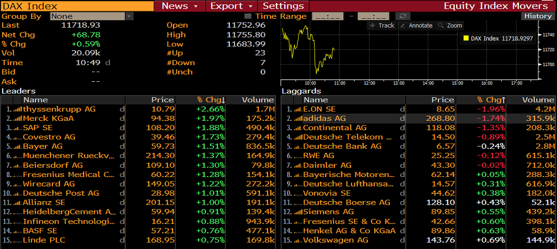 spoločnosti Thyssenkrupp (TKA.DE) naopak rastú napriek sklamaniu zo zisku za Q2. Táto výkonnosť nastala po tom, ako spoločnosť verejne vyhlásila, že bude otvorená predaju viacerých divízií, o ktoré investori žiadali nejaký čas. Cieľom je pomôcť spoločnosti zlepšiť jej finančnú situáciu oslabenú poklesom predaja automobilov.