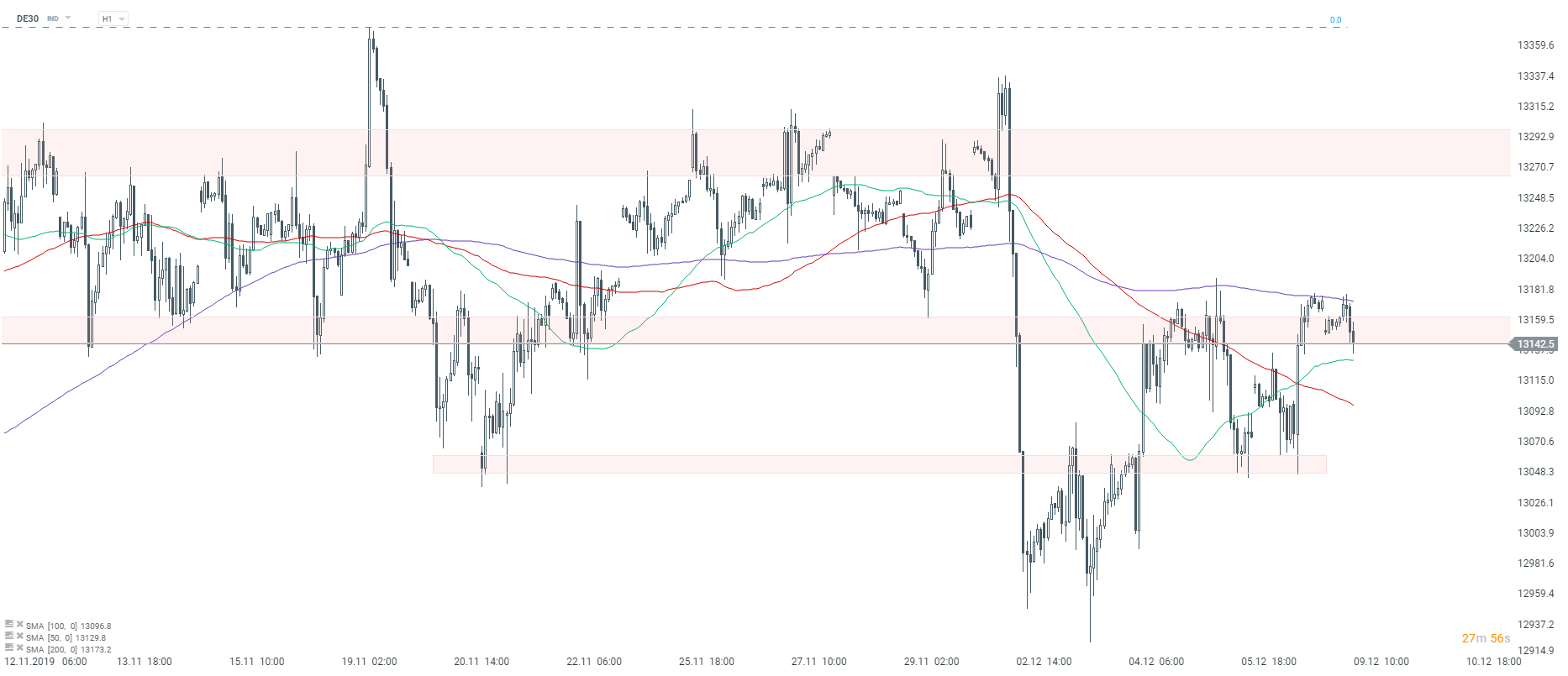 Po prestávke pod dolnou hranicou predchádzajúceho obchodného rozsahu (13150 - 13300 bodov) sa DE30 začal pohybovať v novom bočnom kanáli. Nový rozsah je obmedzený podpornou zónou nad úrovňou 13050 bodov a 200-hodinovým kĺzavým priemerom slúžiacim ako odpor (fialová čiara, oblasť 13175 bodov). Horná hranica rozsahu bola testovaná v dnešnej predobchodnej fáze, indexu sa však nad ňu nepodarilo zlomiť a došlo k spätnému ťahu. Pohyb nadol bol zastavený v oblasti 13130 bodov a býky sa snažia posunúť index vyššie. Vzhľadom na to, že za poklesom nie je jasný dôvod, nemožno vylúčiť, že sa index pokúsi znovu otestovať uvedený kĺzavý priemer v zostávajúcej časti obchodovania.
