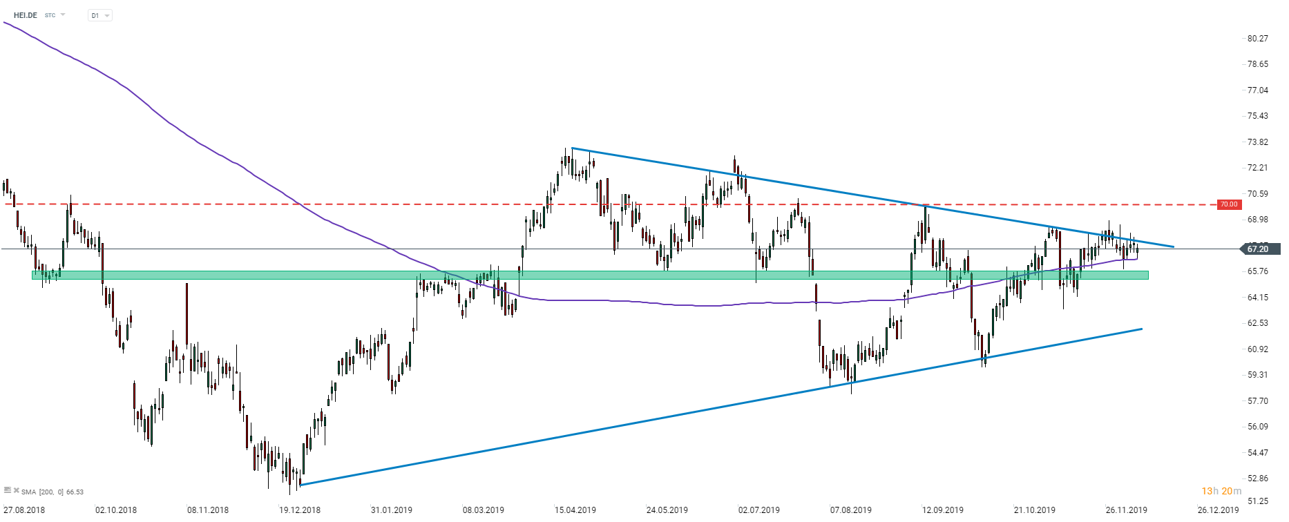 HeidelbergCement (HEI.DE) sa obchodovanie v zúženom rozsahu limitovanom dvoma trendovými líniami. Akcie našli podporu pri 200-periódovom kĺzavom priemere (fialová čiara) a stále testujú hornú hranicu rozsahu. V prípade, ak by došlo k výraznejšiemu pohybu smerom nahor, cena by sa mohla dostať k úrovni 70 EUR. Zdroj: xStation5