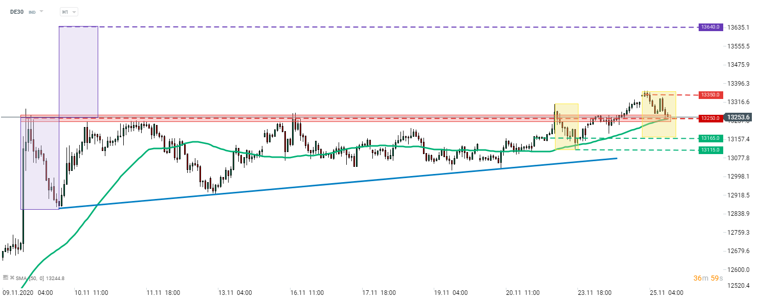 DE30 včera ťažil z celkovej eufórie trhu a dokázal dokončiť deň nad kľúčovou krátkodobou cenovou zónou na úrovni 13 250 bodov. Cez noc bolo možné pozorovať malú korekciu a index vykonal opätovné testovanie vyššie uvedenej zóny ako podporu. Pokles bol doteraz zastavený na 50-hodinovom kĺzavom priemere (zelená čiara). Existuje niekoľko úrovní, ktoré je potrebné sledovať. Ak by sme videli pokles pod 50-hodinovým kĺzavým priemerom, dve krátkodobé úrovne, ktoré treba sledovať, sú spodná hranica štruktúry Overbalance na hladine 13 165 bodov (žltá skrinka) a lokálne minimum na úrovni 13 115 bodov (zlom nižšie by narušil trendovú štruktúru vyšších miním). Pokles pod tieto úrovne by mohol naznačovať krátkodobý medvedí zvrat trendu. Na druhej strane, v prípade, že býci znovu získajú kontrolu, možno nájsť prvý krátkodobý odpor v oblasti 13 350 bodov (nedávne miestne maximum). Konečný odpor je na hladine 13 640 bodov.