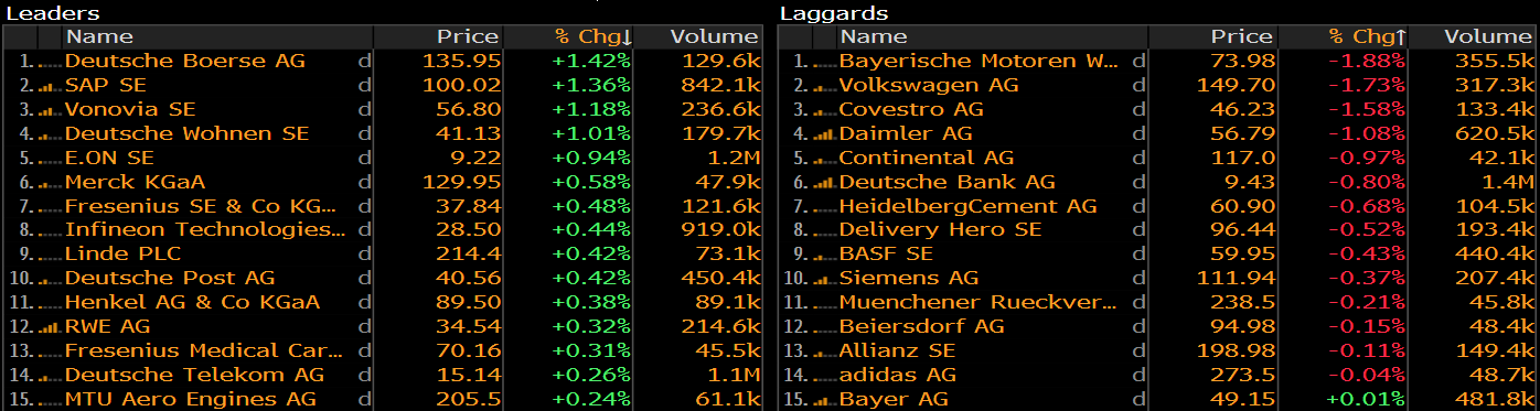 Společnosti indexu DAX dnes nezaznamenaly žádné výrazné pohyby. Zdroj: Bloomberg