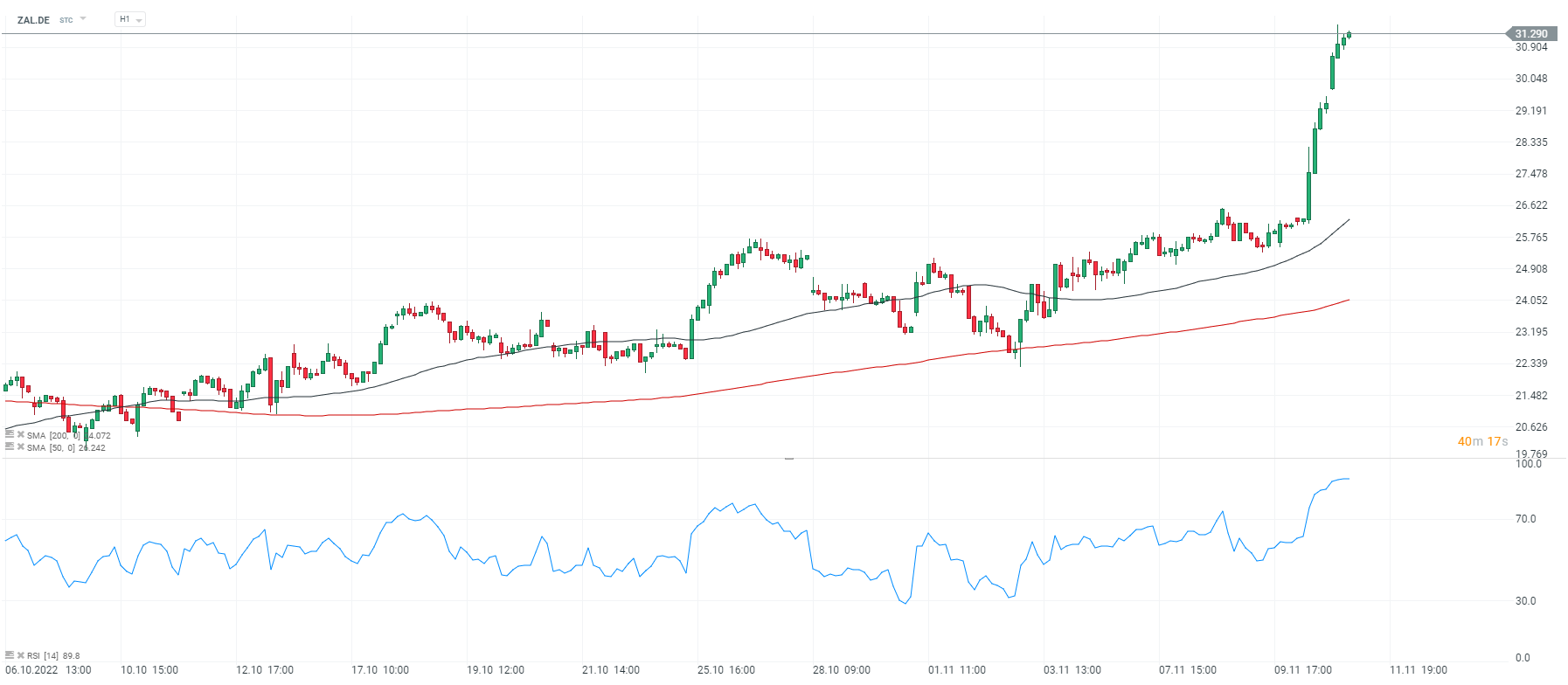 Akcie Zalando (ZAL.DE) H1 interval. Akcie předního německého e-commerce prodejce dnes rostou o téměř 7 %. Index relativní síly RSI se přiblížil k úrovni 90 bodů, což signalizuje potenciální překoupenost. Zdroj: xStation5