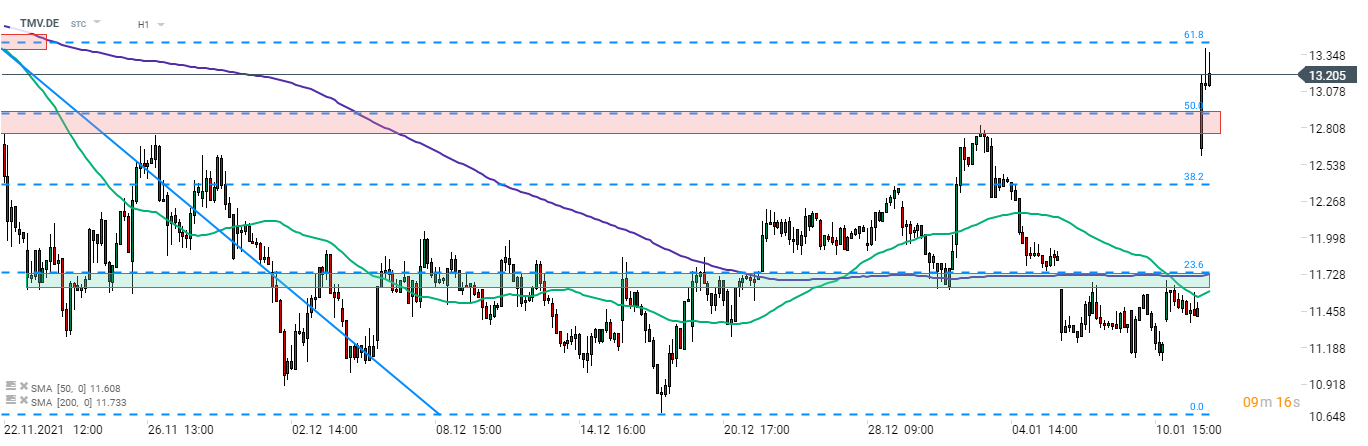 Akcie TeamViewer (TMV.DE) po oznámení predbežných výsledkov za 4. štvrťrok vzrástli. Akcie vyskočili nad zónu odporu pri 50 % retracemente poklesu, ktorý sa začal začiatkom novembra 2021. Cena dnes testovala rezistenciu na 61,8 % retracemente (13,44 EUR), ale nepodarilo sa jej ju prekonať. Zdroj: xStation5
