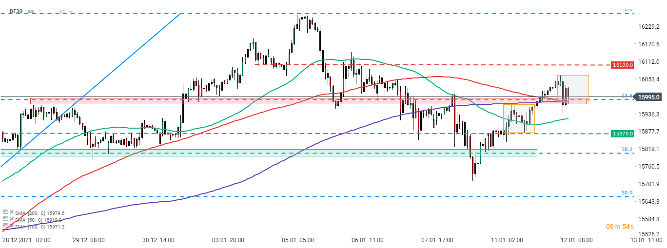 Indexu DE30 sa napokon po niekoľkých pokusoch podarilo prelomiť nad hranicu odporu vo výške 16 000 bodov. Pohyb nahor sa však zastavil po dosiahnutí oblasti 16 060 bodov. Index následne klesol, ale našiel podporu v spomínanej oblasti 16 000 bodov, ktorá bola navyše posilnená geometriou miestneho trhu. Ak sa býkom podarí ubrániť túto úroveň, môže nasledovať posun smerom k hladine 16 100 bodom. Akcie môžu zaznamenať skokový nárast volatility dnes, keď budú zverejnené údaje CPI v USA (14:30).