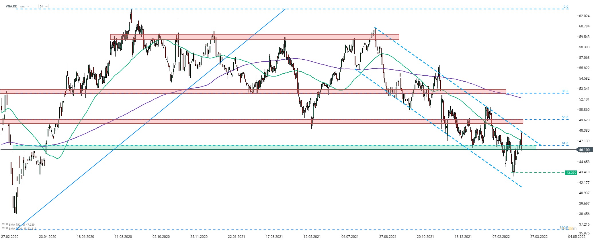 Vonovia (VNA.DE) se obchoduje níže poté, co deklarovala nižší dividendu na akcii jak před rokem. Akcie se stahují z horní hranice sestupného kanálu a v současnosti se snaží klesnout pod zónu podpory označenou 61,8% retracementem. Prolomení níže by připravilo cestu pro test místního minima v oblasti 43,35 EUR. Zdroj: xStation5