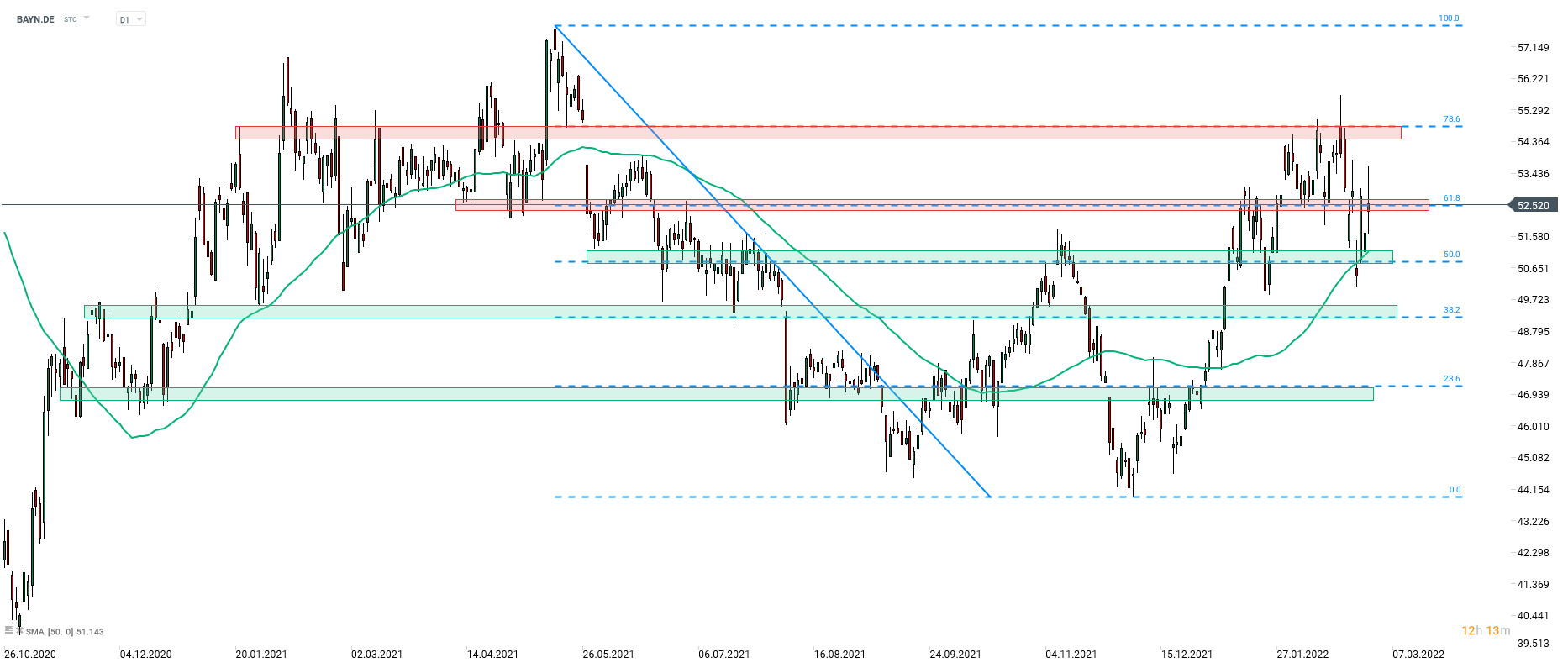 Bayer (BAYN.DE) sa dnes obchoduje vyššie. Akcie na začiatku dnešnej seansy vyskočili nad zónu odporu 52,50 EUR, ale neskôr sa vrátili do tejto oblasti. Veľa bude závisieť od toho, kde akcie zamieria teraz. Ak sa im nepodarí opäť prekonať hranicu 52,50 EUR a zaznamenajú pokles späť nadol, na grafe sa môže vytvoriť vzor pravého ramena hlavy a ramien. Zdroj: xStation5