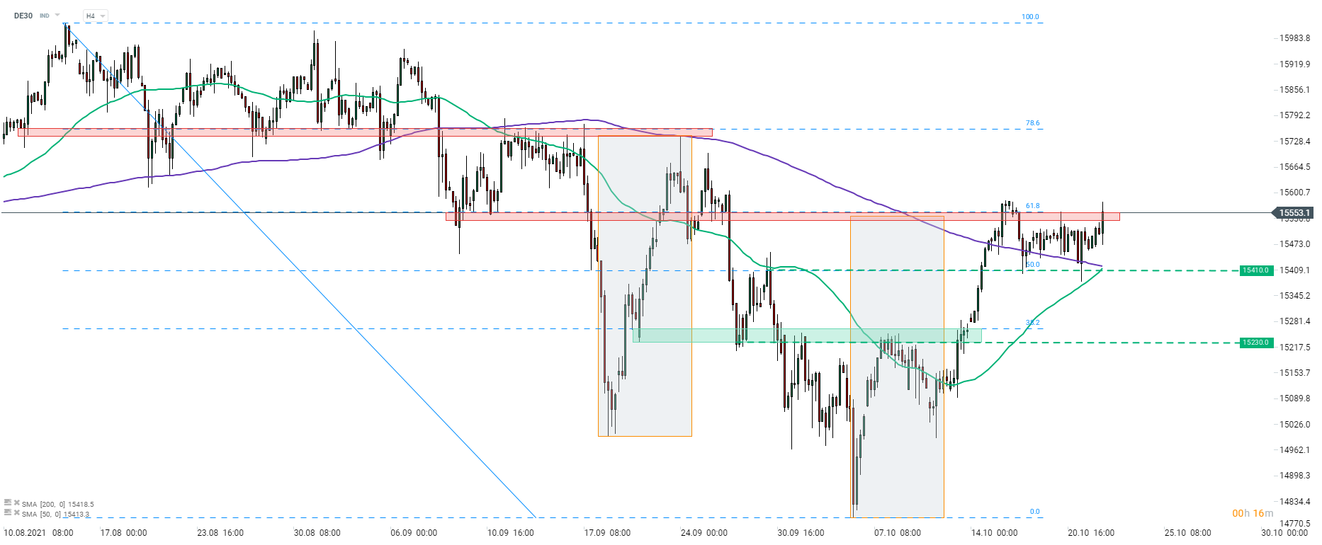 - DE30 testuje odpor na úrovni 15 550 bodov