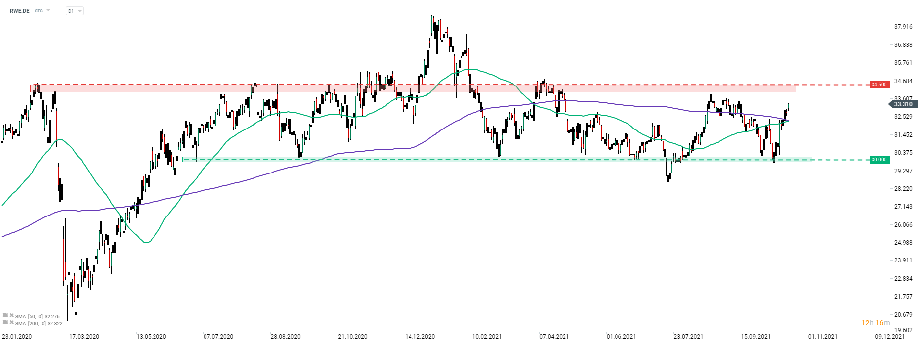 Akcie spoločnosti RWE (RWE.DE) sa začiatkom tohto týždňa prelomili nad kĺzavý priemer s periódou 200 (fialová čiara). Po včerajšom prelomení sa dnes pohyb nahor obnovil vďaka aktualizácii akcií prijatých v HSBC. Kľúčový odpor sa nachádza okolo úrovne 34,50 €-horná hranica rozsahu. Zdroj: xStation5