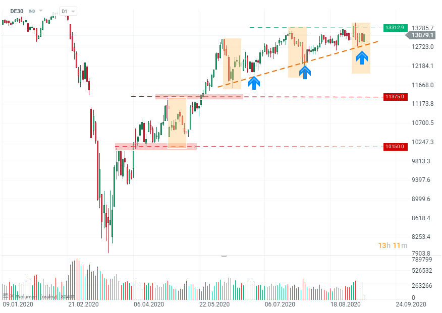 Z technického pohledu je důležité, že DE30 ubránil rostoucí trendovou čáru, která index provází už od června. Pouze její průraz by mohl vyvolat hlubší korekci. Poslední takový pokles přišel na počátku června.