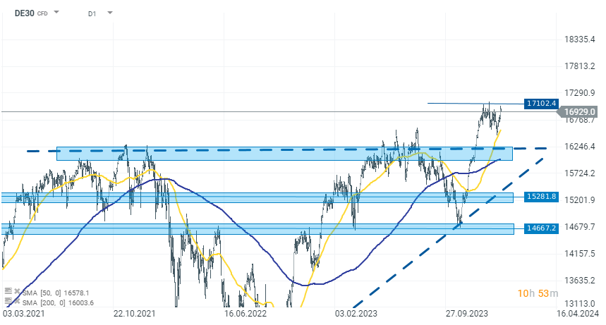 Index DAX sa obchoduje na úrovni 16 929, čo predstavuje mierny pokles o 0,30 %. Napriek tomu je index blízko svojho rekordného maxima z polovice decembra na úrovni okolo 17 100 bodov.