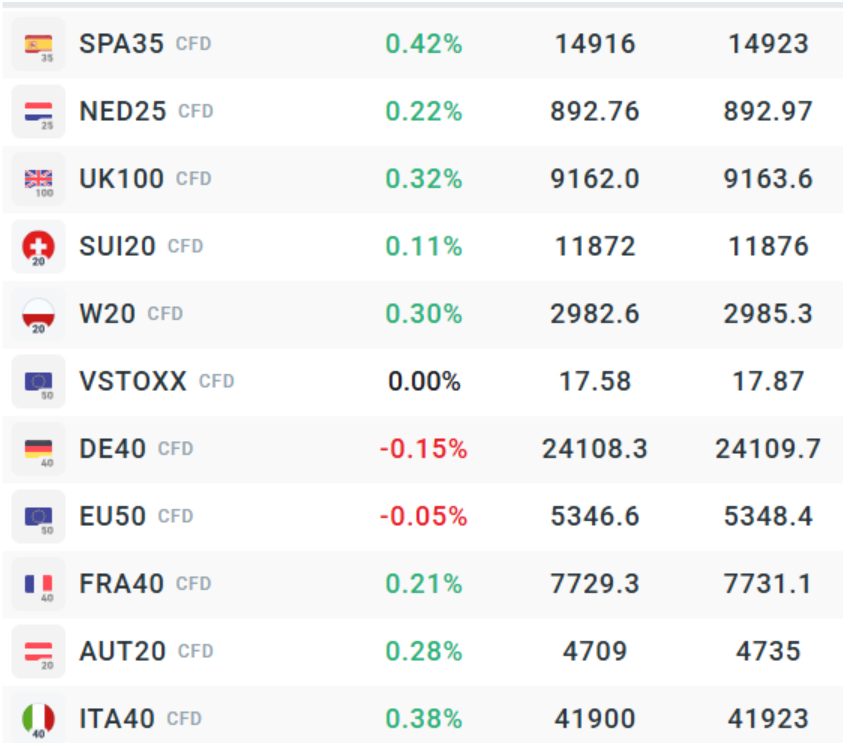 Prvá polovica seansy na európskych trhoch sa nesie v znamení opatrného optimizmu investorov. Pozitívnu náladu podporuje predĺženie obchodného prímeria medzi USA a Čínou. To by mohlo dlhodobo podporiť luxusné spoločnosti, hoci dnešná seansa to zatiaľ nenaznačuje. Neistota pretrváva kvôli nadchádzajúcim mierovým rokovaniam na Aljaške a neuspokojivým makroekonomickým výhľadom niektorých európskych krajín. Indexy DE40 a EU50 dopoludnia strácajú 0,15 % a 0,05 %, zatiaľ čo ostatné európske indexy rastú približne o 0,2–0,4 %.