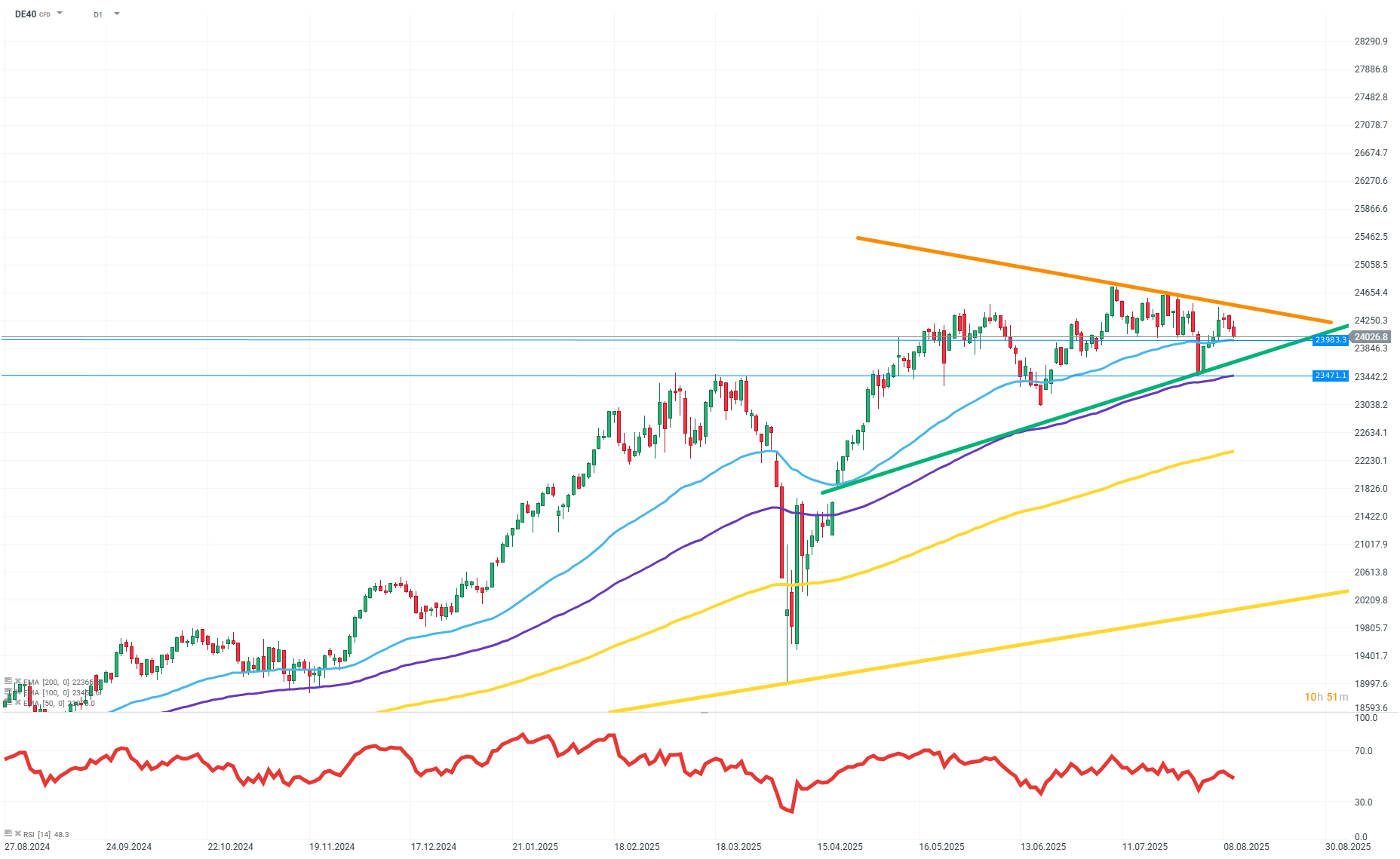 DE40 pokračuje vo včerajších poklesoch a aktuálne sa pohybuje okolo miním z predchádzajúcej seansy približne na úrovni 24 080 bodov. Na grafe je jasne viditeľná formácia zužujúceho sa trojuholníka, po ktorej dokončení trh pravdepodobne určí smer na nasledujúce dni. Ďalšia technická podpora sa nachádza na úrovni 23 983 bodov, kde leží EMA-50, nasledovaná rastovou trendovou líniou od apríla tohto roka a EMA-100. Ak dôjde k ich prelomeniu, možno očakávať ďalšie poklesy. Optimizmus do grafu pridávajú dlhodobé aj strednodobé rastové trendové línie.
