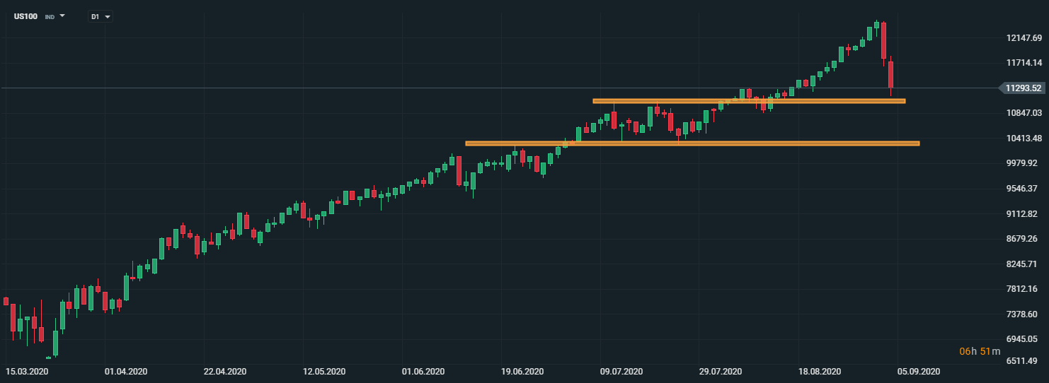 Americký akciové index US100 sa približuje k supportu na úrovni 11 070 bodov. V prípade, ak cena dokáže prekonať psychologickú hranicu 11 000 bodov, otvorí sa priestor na dodatočný pokles k hranici 10 400 bodov. Zdroj: xStation5