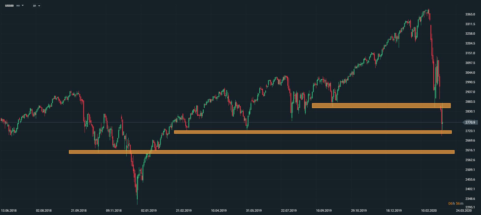 Americký akciový index US500 nedokázal udržať skoré zisky a približuje sa k supportu na úrovni 2700 bodov. V prípade pokračujúcej neistoty na trhoch, môže akciový index v dohľadnej dobe prekonať spomínanú úroveň supportu, pričom ďalšia dôležitá úroveň podpory sa nachádza na hladine 2600 bodov. Zdroj: xStation5