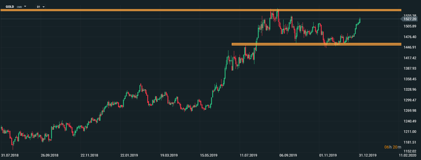 Zlato reagovalo na tieto správy rastom a približuje sa k rezistencii na úrovni 1550 bodov. V prípade, ak by cena dokázala prekonať vyššie spomínanú úroveň rezistencie, otvorí sa priestor pre rast k psychologickej hladine 1600 bodov. Zdroj: xStation5