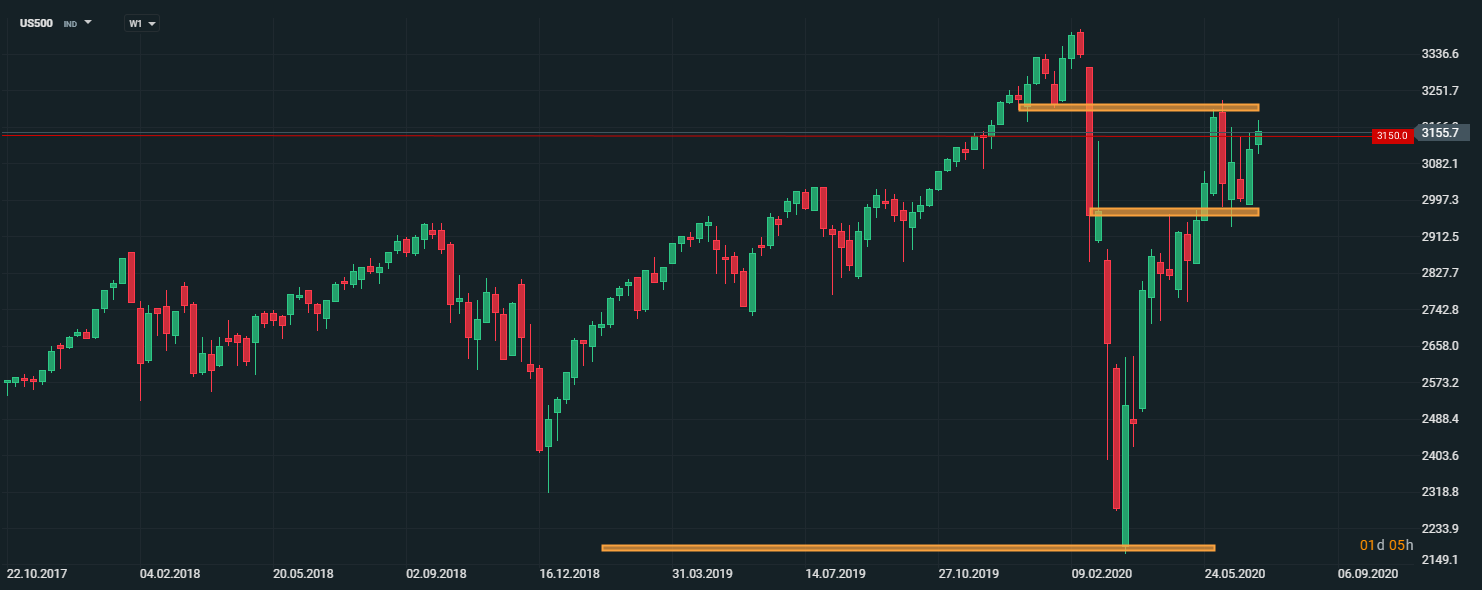 Americký akciový index US500 sa obchoduje v blízkosti vrchnej časti obchodného pásma. Ďalší vývoj bude závisieť najmä od nálady na finančných trhoch behom budúceho týždňa. Zdroj: xStation5