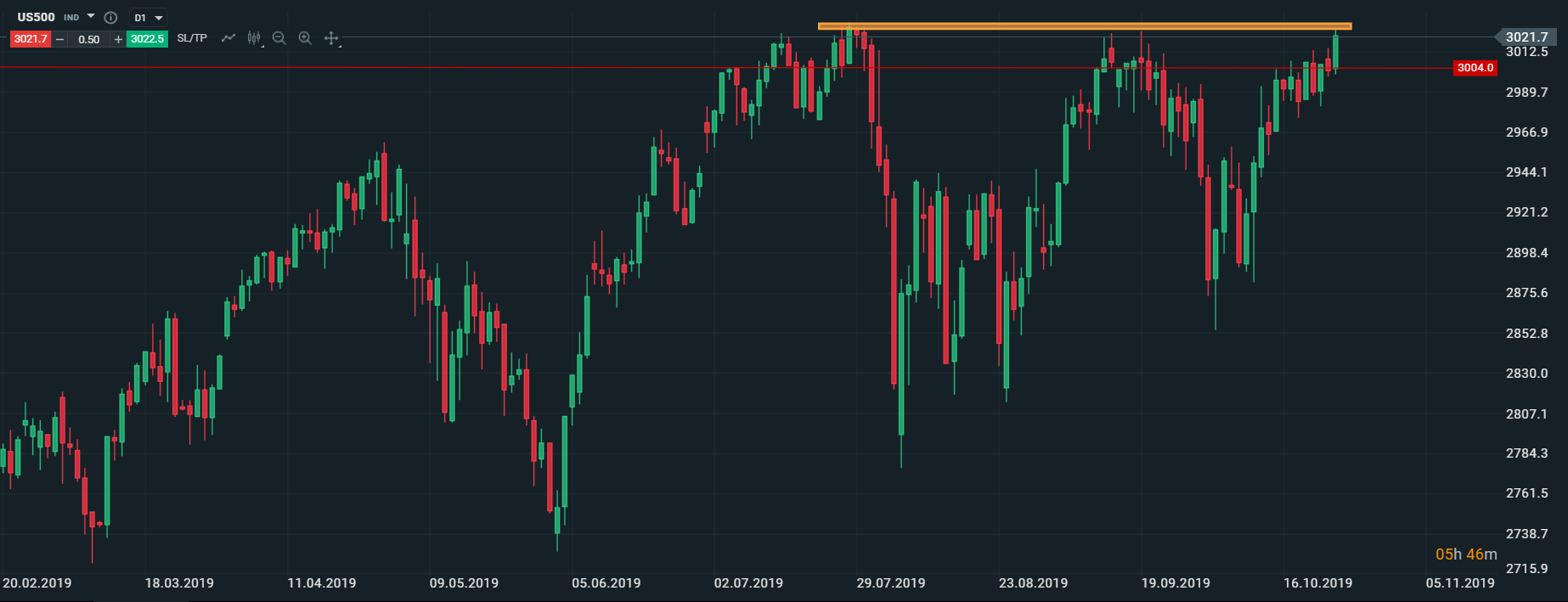 Americký akciový index US500 testuje historické maximá na úrovni 3020 bodov. V prípade, ak denná sviečka dokáže uzavrieť nad vyššie uvedenou úrovňou, otvorí sa priestor pre rast k úrovni 3050 USD. Zdroj: xStation5