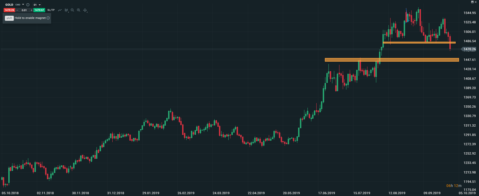 Cena zlata prekonala dôležitý support na úrovni 1480 bodov a pokračuje v poklese. V prípade, ak denná sviečka dokáže uzavrieť pod vyššie uvedenou úrovňou, otvorí sa priestor pre pokles k supportu na úrovni 1450 bodov. Zdroj: xStation5