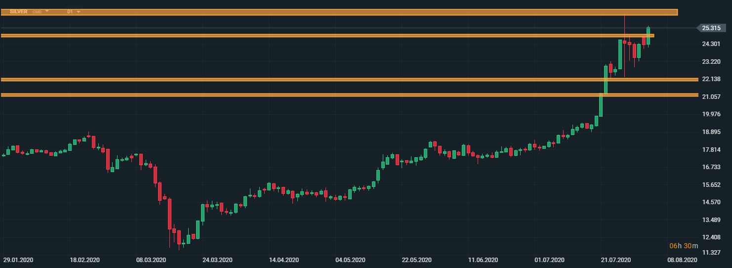 Cena striebra dnes prudko vystrelila smerom nahor a vymanila sa z konsolidačného pásma. Nárast ceny striebra je do značnej miery ovplyvňovaný špekuláciami týkajúcimi sa ďalšieho kola fiškálnych stimulov v USA, čo mimo iného vedie aj k oslabovaniu amerického dolára. V prípade pokračujúceho rastového trendu, cena môže testovať rezistenciu okolo úrovne 26 USD za uncu. Zdroj: xStation5