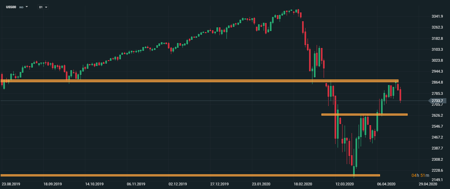 Americký akciový index US500 dnes pokračuje v poklese. V prípade pokračujúcej negatívnej nálady na trhoch sa môžu poklesy ešte rozšíriť. Prvá dôležitá úroveň supportu sa nachádza okolo úrovne 2600 bodov. Zdroj: xStation5