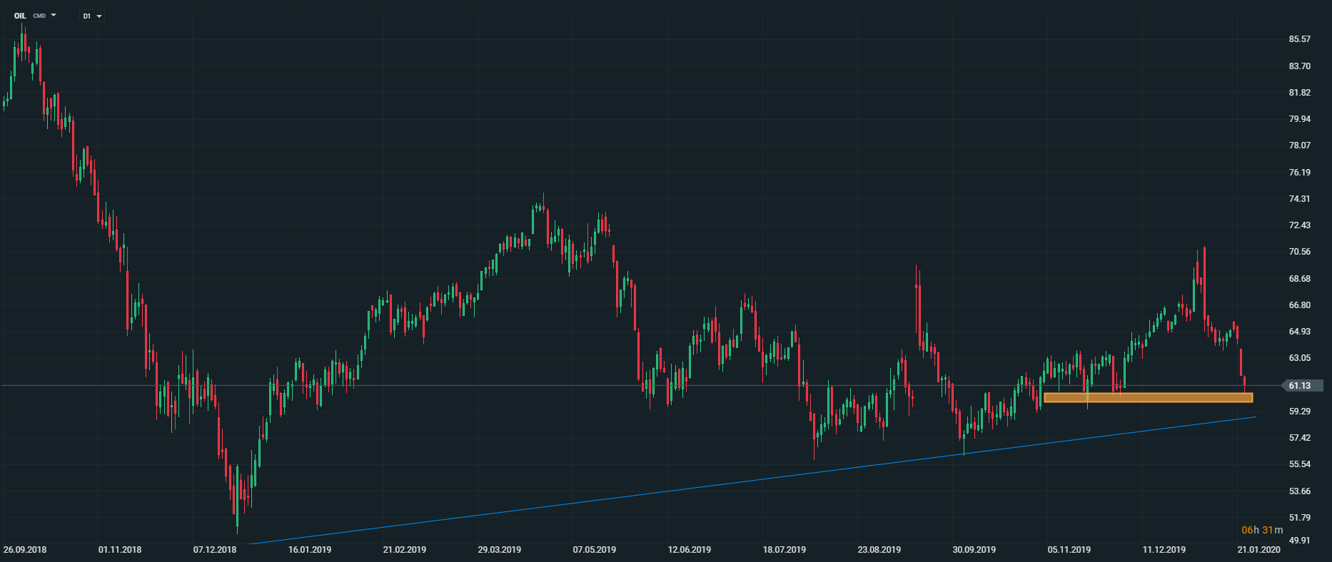 Cena ropy Brent (OIL) pokračuje v poklese a približuje sa k psychologickej hranici 60 USD/bbl. V prípade, ak týždenná sviečka dokáže prekonať spomínanú úroveň, otvorí sa priestor na pokles k rastovej trendovej línii (59 USD/bbl). Zdroj: xStation5
