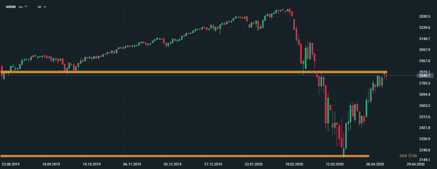 Americký akciový index US500 sa odrazil okolo úrovne 2900 bodov. V prípade, ak by denná sviečka dokázala uzavrieť nad hladinou 2900 bodov, otvorí sa priestor pre rast k úrovni 3000 bodov. Netreba zabúdať na to, že dodatočné stimuly zo strany americkej vlády môžu opäť podporiť sentiment na trhoch, no na druhej strane, ak by sa objavili negatívne správy týkajúce sa koronavírusu, nálada na trhoch sa môže zhoršiť. Zdroj: xStation5