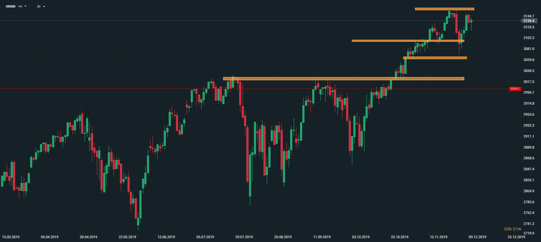 Americký akciový index US500 sa aj napriek rizikám stále obchoduje v blízkosti historicky najvyšších úrovní, čo naznačuje, že investori sú skôr optimistickí ohľadom vzťahov medzi USA a Čínou. V prípade, ak by nevstúpili do platnosti dodatočné clá, indexu by sa otvorila cesta nahor smerom k úrovni 3200 bodov. Zdroj: xStation5