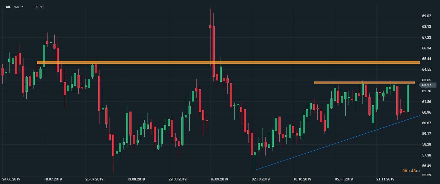Cena ropy Brent (OIL) sa odrazila od spodnej časti trendovej línie a v súčasnosti sa približuje k rezistencii, ktorá sa nachádza okolo úrovne 63,60 USD. V prípade, ak dokáže denná sviečka uzavrieť nad vyššie uvedenou rezistenciou, otvorí sa priestor pre rast k psychologickej hranici 65 USD. Treba mať na pamäti, že ropa má za sebou pomerne prudký nárast, po ktorom častokrát dochádza ku korekciám, čo podporuje aj fakt, že cena ropy je blízko silnej rezistencie. Treba mať na pamäti, že ďalší smer bude do značnej miery určovať piatkové zasadanie krajín OPEC. Zdroj: xStation