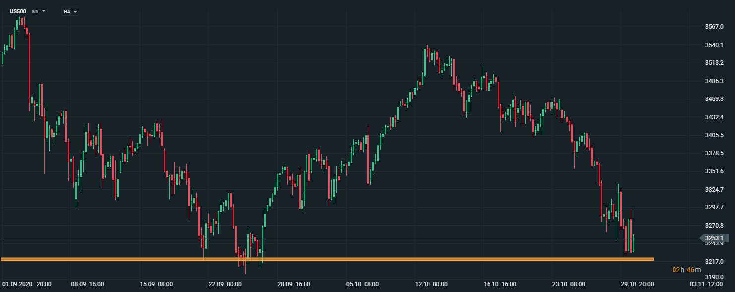 Americký akciový index US500 dnes opäť testoval support na úrovni 3220 dolárov, no neskôr sa od tejto úrovne odrazil smerom nahor k hladine 3250 dolárov. V prípade, ak bude pretrvávať negatívna nálada aj počas minulého týždňa, akciové indexy môžu pokračovať v poklese. Zdroj: xStation5