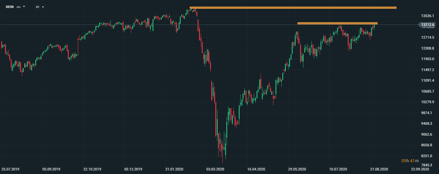 Nemecký akciový index DE30 dnes zaznamenal vďaka dodatočným fiškálnym stimulom nárast a približuje sa k lokálnym maximám, ktoré sa nachádzajú pod hladinou 13 300 bodov. V prípade, ak akciový index dokáže prekonať lokálne maximá, otvorí sa priestor na rast k historickým maximám, ktoré sa nachádzajú okolo úrovne 13 800 bodov. Zdroj: xStation5