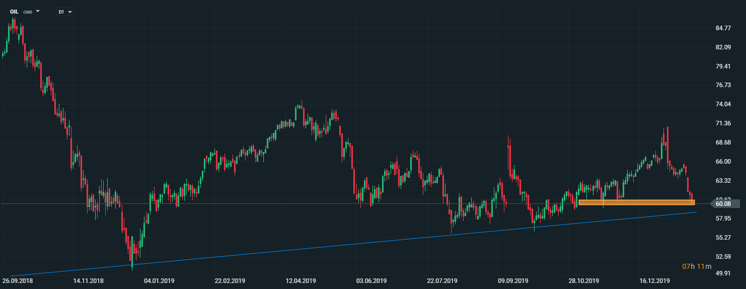 Cena ropy Brent (Oil) dnes testuje psychologickú hranicu na úrovni 60 USD/bbl. V prípade, ak by dokázala týždenná sviečka uzavrieť pod vyššie uvedenou úrovňou, otvorí sa priestor na pokles k rastovej trendovej línii (59 USD/bbl). Zdroj: xStation5